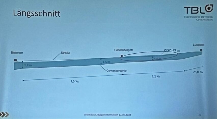 Am 12.5.2025 hatte die TBL eine Bürgerinformationsveranstaltung zum Thema der Wiembachumgestaltung, um einen Hochwasserschutz gemäß der EU Hochwasserverordnung für ein HQ100 (100-jahriges Hochwasser der Statistik)zu erreichen.Herr OB Richrath sowie Herr Riedel (TBL) führten in den Abend ein. Herr Riedel betonte, dass man am Anfang der Planungen sei und sich der heutige Abend nur die möglichen Planungen Wiembach behandele. Verschiedene ReferentInnen erläuterten die Aspekte: