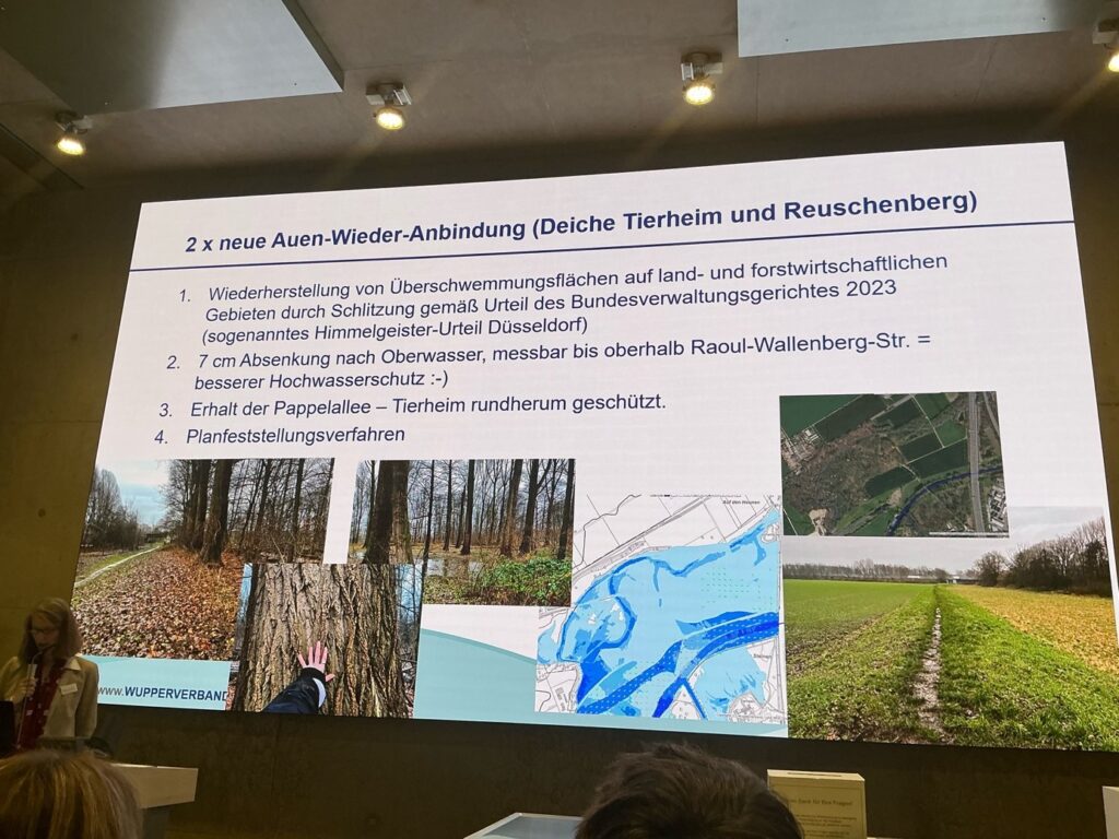 Frau Dr. Liebeskind (Wupperverband) und Frau Möller (TBL) erläuterten anschaulich die Ergebnisse des Gutachtens, das durch die renommierte Firma Hydrotec erarbeitet wurde. Ausdrücklich wurde das Thema Gestaltung des Wiembach an der Allee nicht besprochen, da die Ausschreibungen für die Planungen noch laufen.